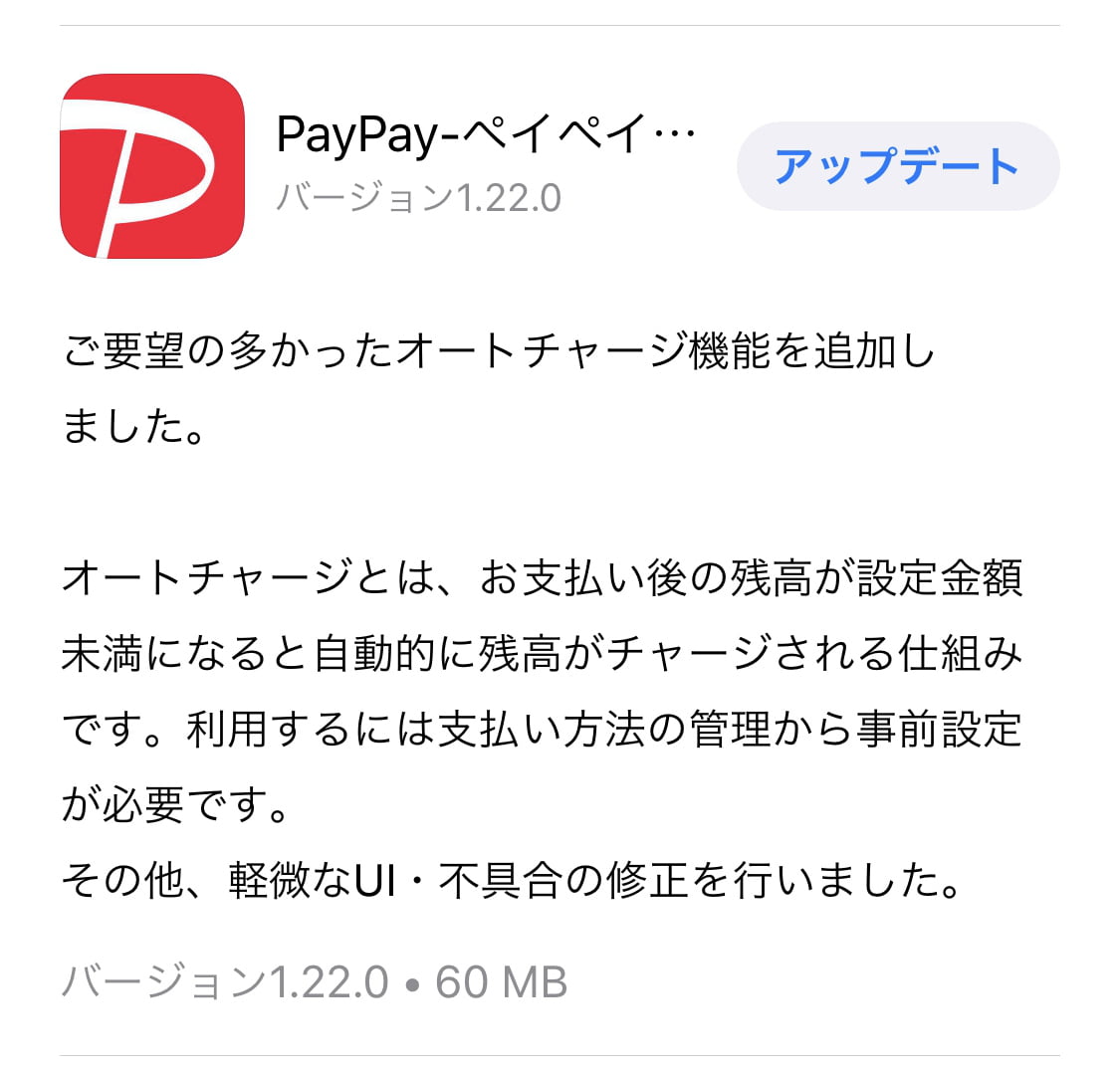 バージョン1.22.0より判定金額を下回ると自動でチャージが行えるようになりました。